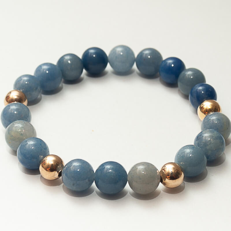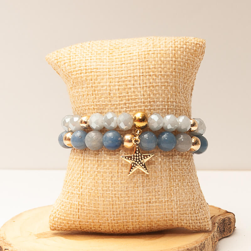 Pulsera principal: elaborada con piedras naturales azul cielo y detalles en goldfilled, acompañada de un dije de estrella dorada que simboliza guía, esperanza y propósito.