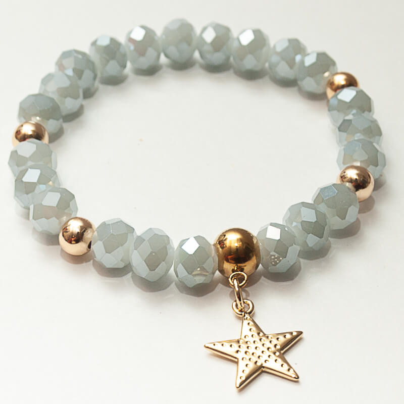 Pulsera secundaria: hecha con cristales facetados gris perla y acero inoxidable, que aportan una luminosidad sutil y elegante, reflejando la calma del amanecer sobre el agua.