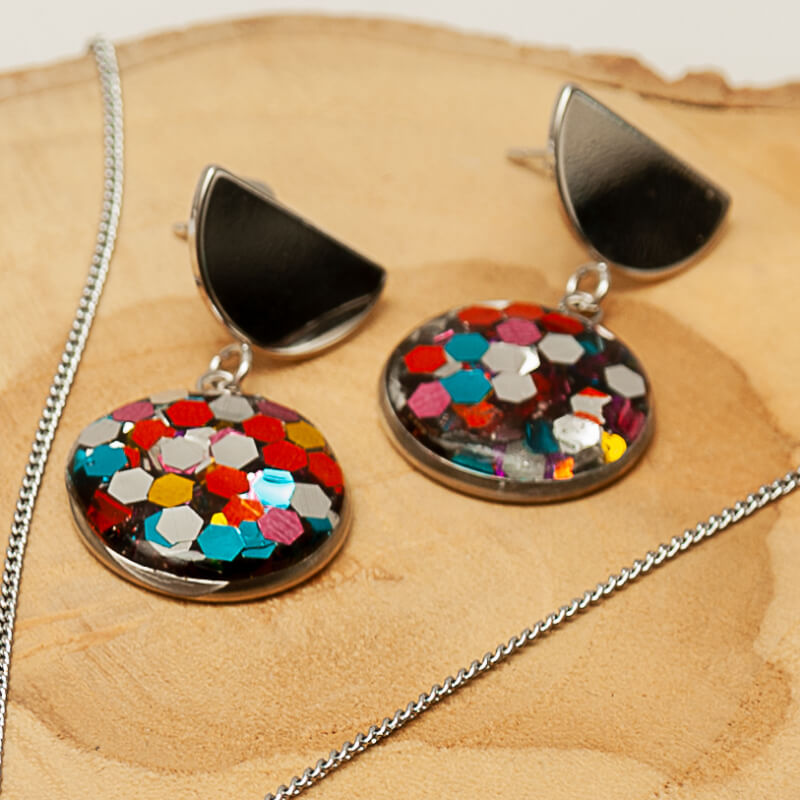 Resin pieces with vibrant tones and silver details that celebrate creativity, confidence, and a playful spirit