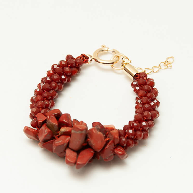 Woven bracelet with red jasper, crystal, steel, and gold-filled accents.
