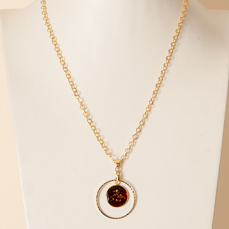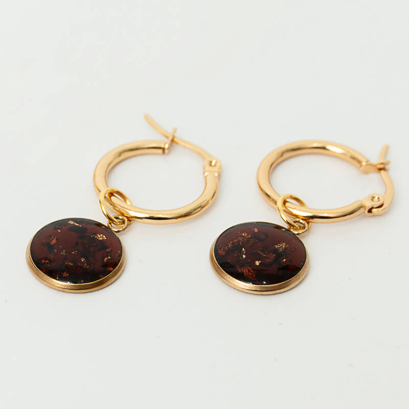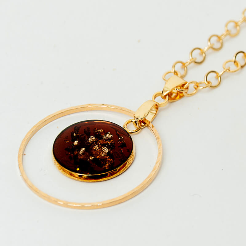 Modern and timeless, this design blends deep amber resin with golden circles that evoke balance and sophistication