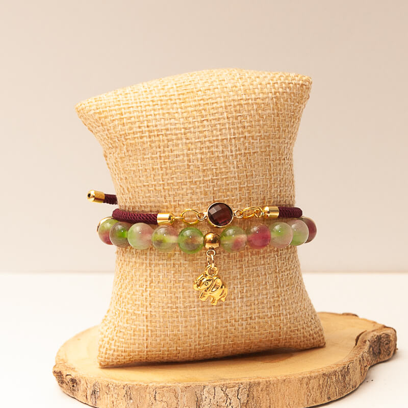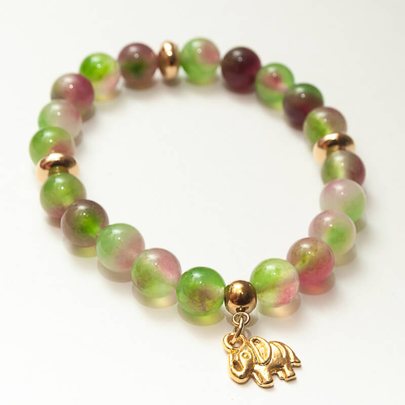 Pulsera principal: Elaborada con cuentas de ágata verde y rosa sandía, una piedra que simboliza equilibrio, amor y vitalidad. Su diseño se realza con detalles en goldfilled y un dije dorado en forma de elefante, símbolo de protección, sabiduría y buena fortuna.