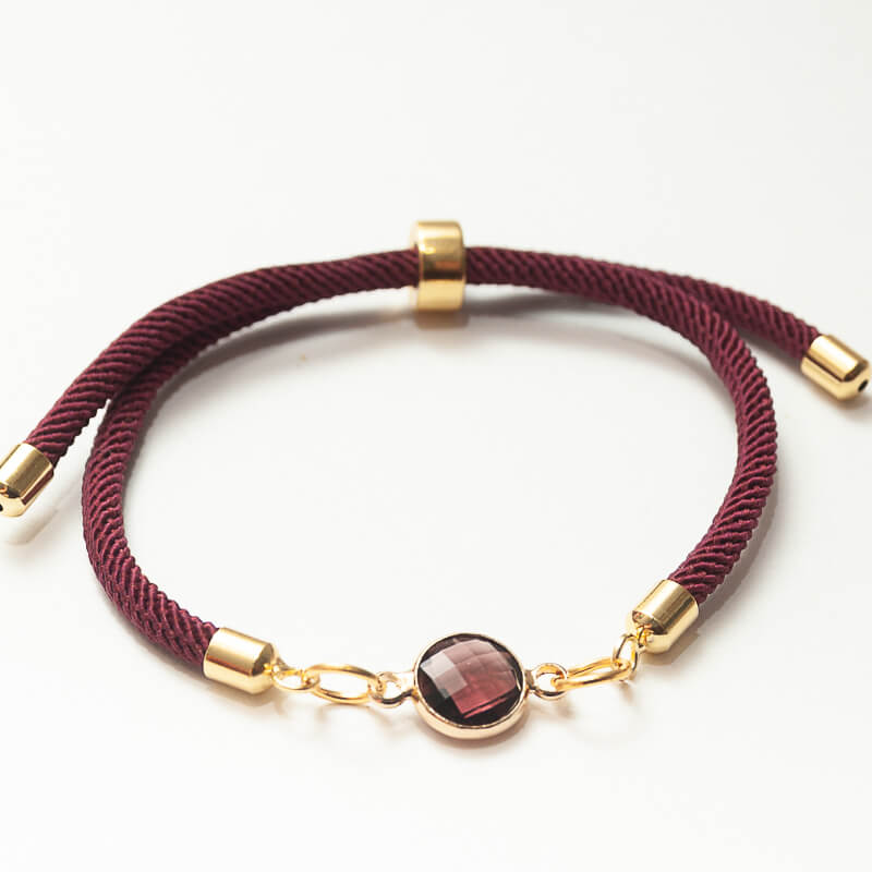 Pulsera secundaria: Tejida en cordón textil color vino profundo, incorpora un cristal tallado en tono granate montado en marco dorado. Este detalle aporta un contraste elegante y sereno, reflejo de fuerza interior y sofisticación natural.