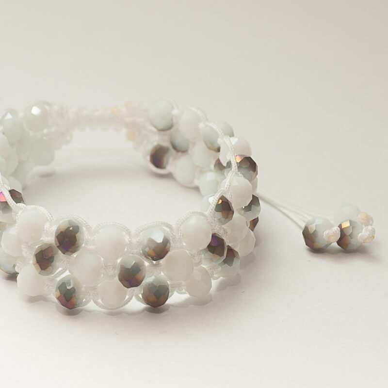 Pulsera principal: Tejida a mano con cristales facetados en tonos blanco lunar y gris perlado, que reflejan la energía de la quietud y la claridad emocional.