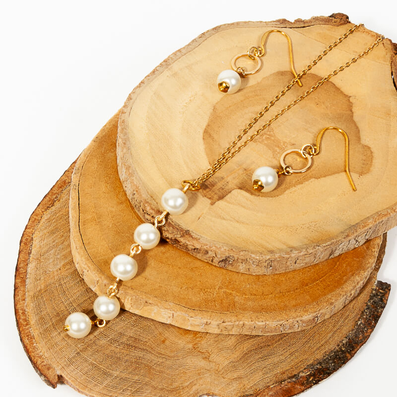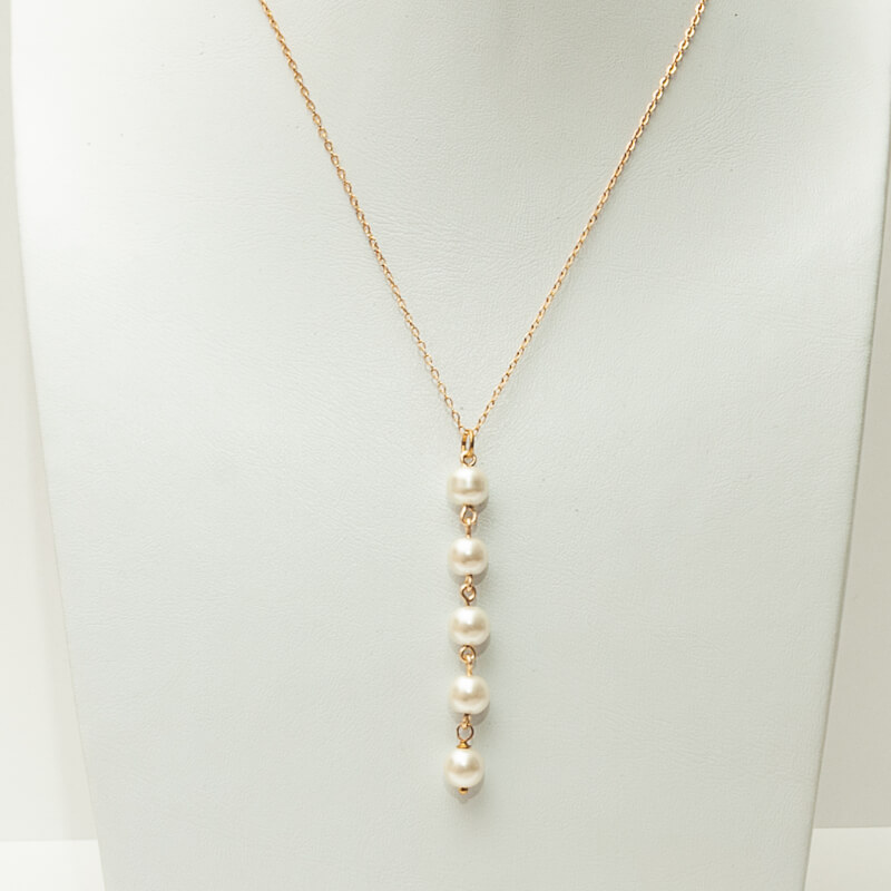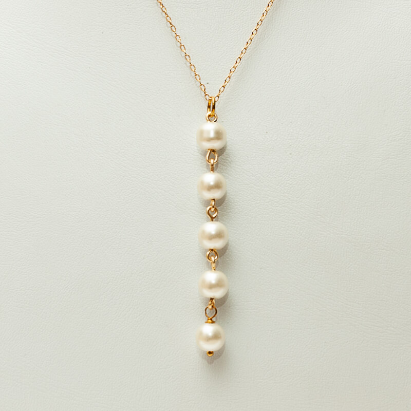 Collar artesanal: Hecho a mano con perlas sintéticas nacaradas dispuestas en caída vertical, unidas por finos eslabones de goldfilled que aportan brillo cálido y elegancia.