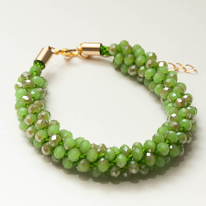 Pulsera principal: Elaborada con cristales facetados verdes de brillo sutil y reflejos dorados, entrelazados a mano sobre hilo verde intenso. Su textura trenzada aporta volumen y movimiento, evocando el ritmo orgánico de la naturaleza. Los extremos metálicos en baño dorado completan la pieza con un toque sofisticado y contemporáneo.
