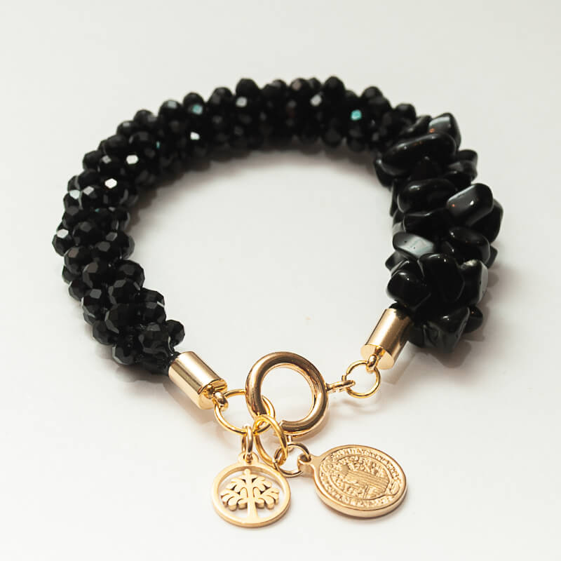 El diseño se complementa con detalles dorados en goldfilled y dijes simbólicos —un dije de San Benito y un árbol de la vida— que evocan equilibrio, abundancia y conexión con las raíces.