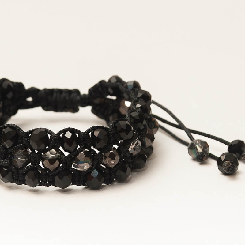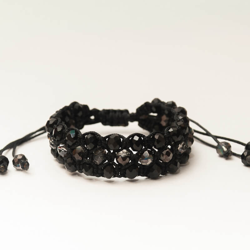 Pulsera principal: Tejida a mano en cordón negro trenzado, con cristales facetados en tonos negro ónix y gris humo que capturan la luz con destellos sutiles.