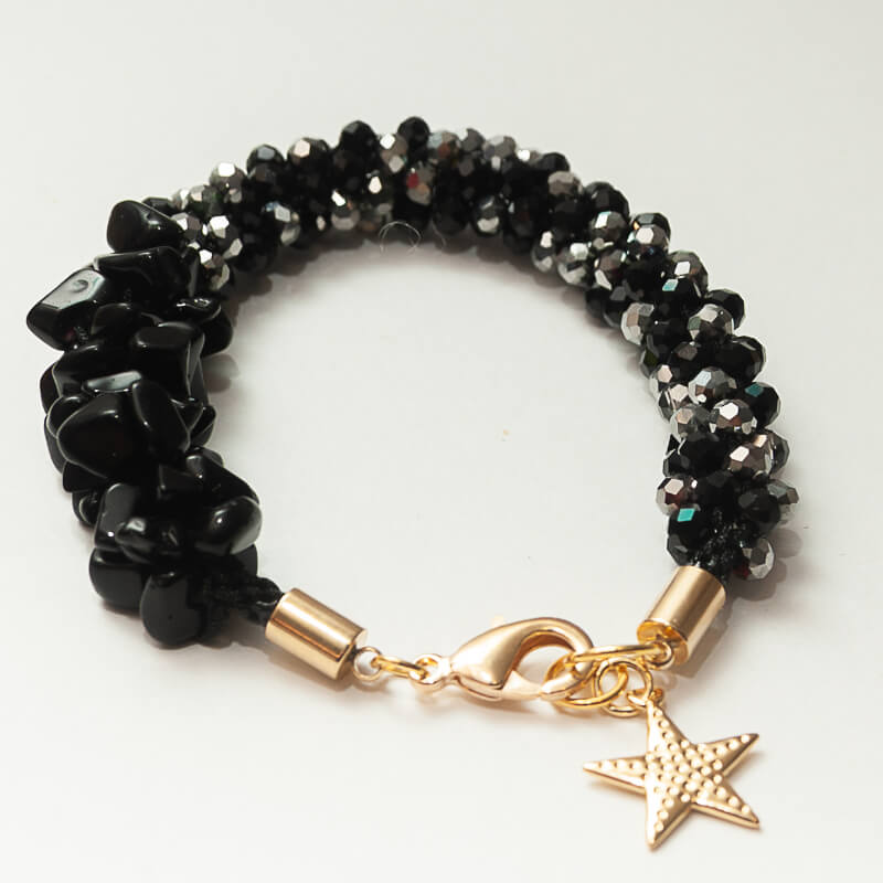 Pulsera principal: Tejida a mano con cristales negros facetados y chips naturales de ónix, una piedra símbolo de protección, fortaleza y determinación. Los extremos metálicos en baño dorado aportan equilibrio y refinamiento, mientras que el dije en forma de estrella marina dorada representa guía interior y confianza en el propio rumbo.