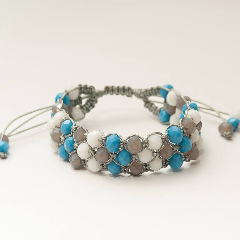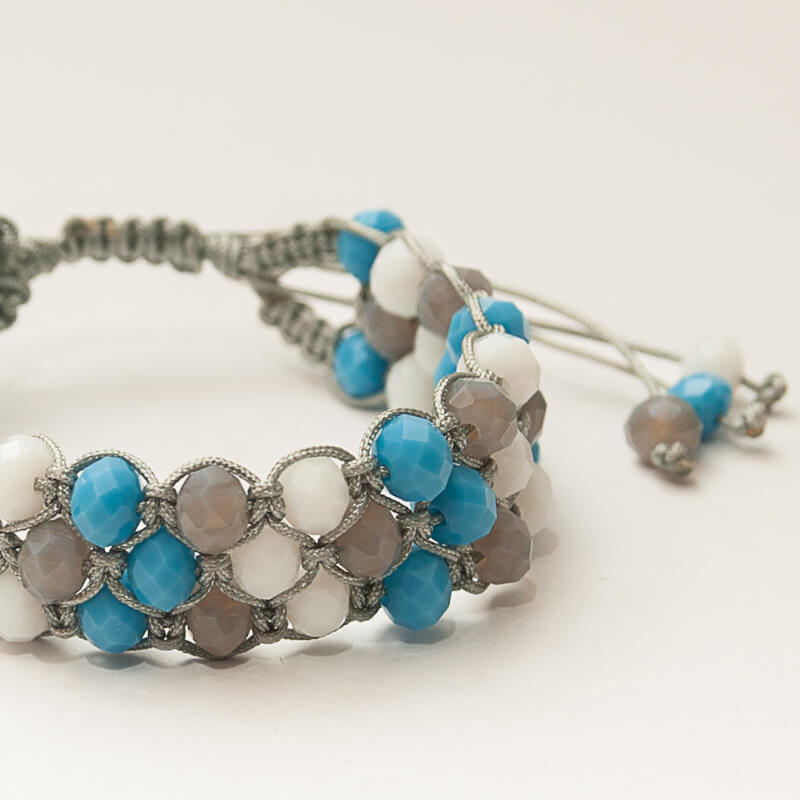 Pulsera principal: Tejida a mano con cristales facetados en tonos turquesa, blanco nublado y gris perla, que evocan la transición del cielo entre la calma y la brisa.