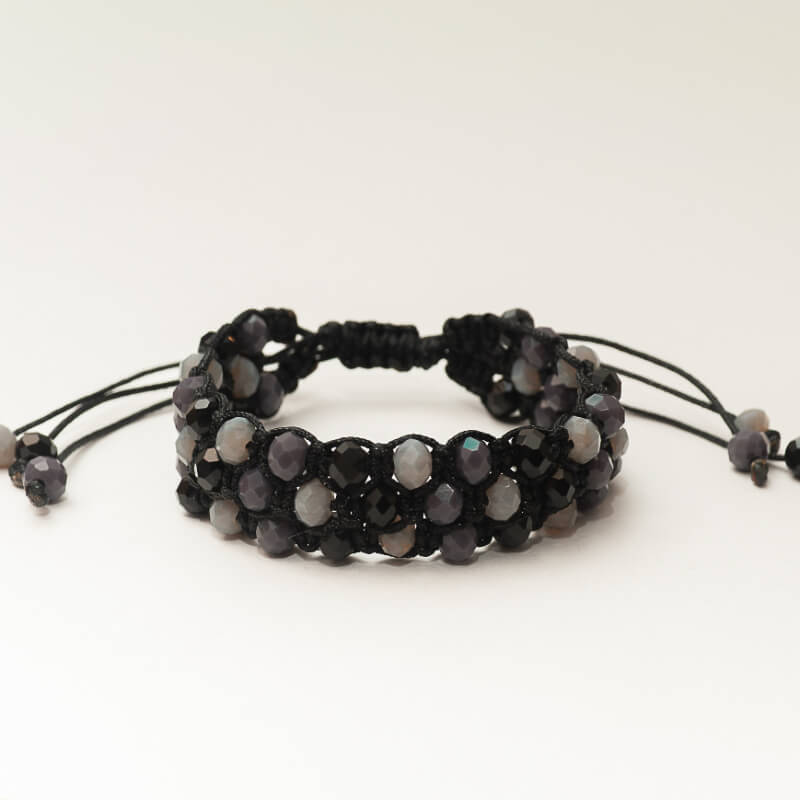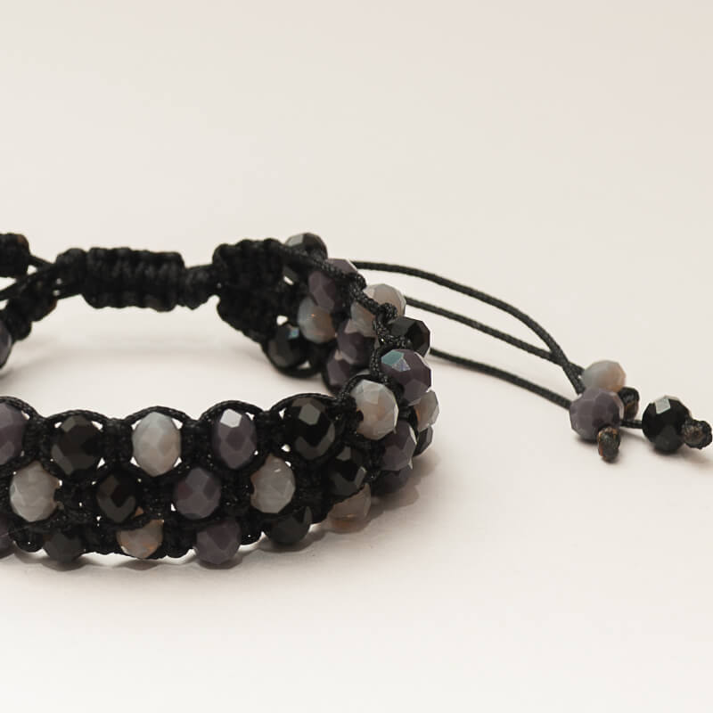 Pulsera principal: Tejida a mano con cristales facetados en tonos negro, gris humo y amatista profunda, que simbolizan protección, transformación y sabiduría emocional.